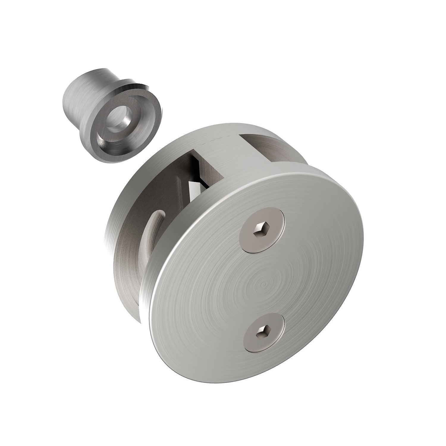 Držiak skla pre zábradlie mimoosový - jednostranný. Držiak-stlpik montazny spoj. Uchytenie skla zverny spoj.