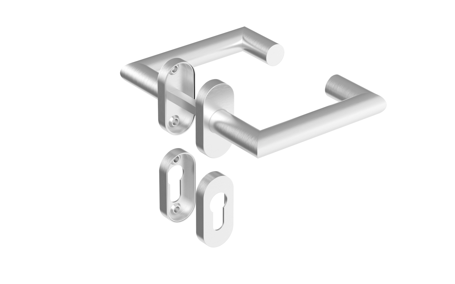 Kľučka so štítkom na cylindrickú vložku - 1pár - brusený nerez, možnosť otočenia pružinového vratného mechanizmu pre zmenu smeru otvárania