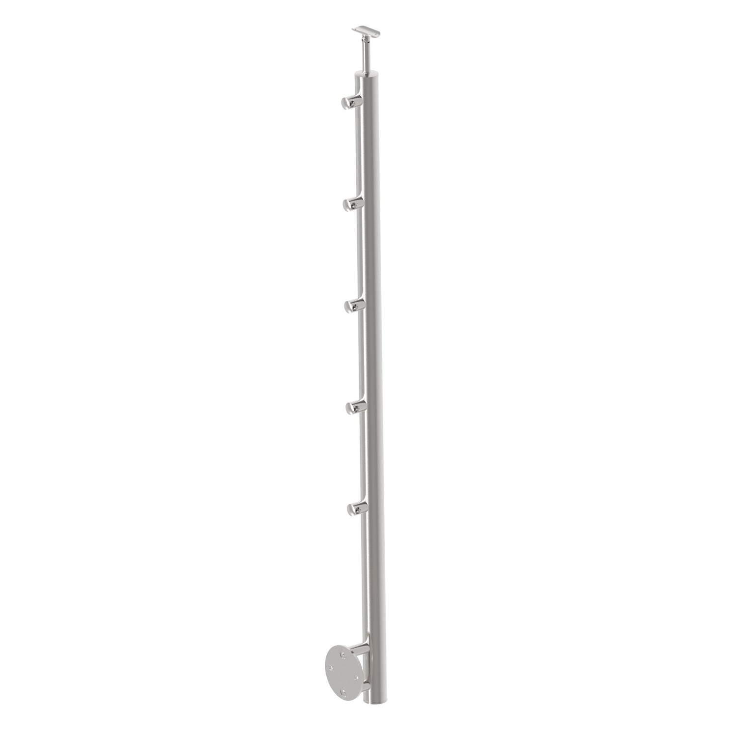 Stainless steel post D42.4 mm for handrail D42.4 mm. Side mounting, horizontal filling 5 x d12 mm. Designed for staircase railing height of 100 cm, for installation with a maximum overhang of up to 12 m. Possibility to adjust the slope of the filling and handrail.