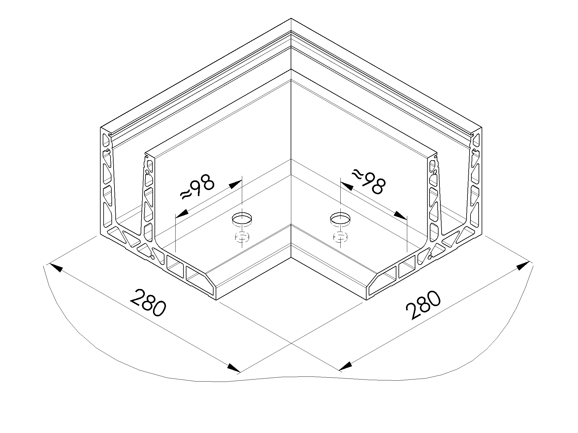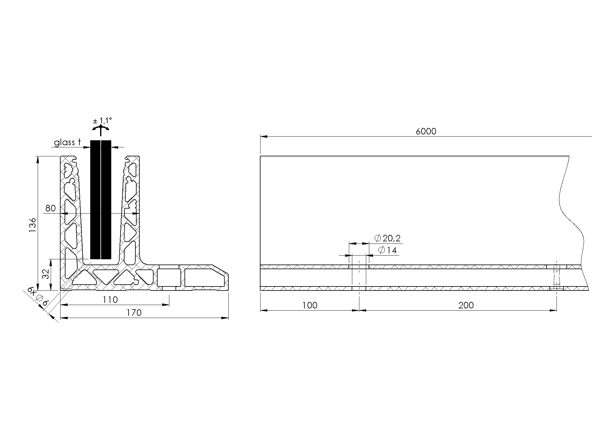 Alumínium rögzítő profil ELOX, rögzítés felülről a padlóba, állítható üveglejtés. Szállítva L2500mm hosszúságban (13 db d14mm-es lyukkal a rögzítéshez). Tömítések nélkül szállítva. Felületkezelés ELOX - csiszolt.